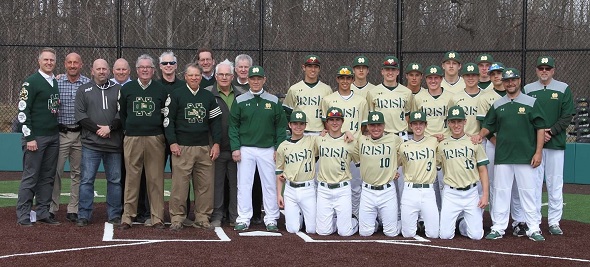 PHOTOS: (Top) Pontiac Notre Dame Prep players huddle on their new field this season. (Middle) Notre Dame Prep catcher Ryan Knutson looks to his dugout. (Below) The current Irish and 1972-73 alums stand together during the field dedication this spring. (Photos courtesy of the Pontiac Notre Dame Prep baseball program.)