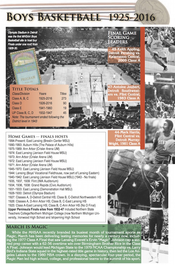 The Boys Basketball Finals were first played only a few months after the MHSAA formally was formed in December 1924. More than 400 champions have been honored over nearly a century of games that traditionally have finished up each winter.