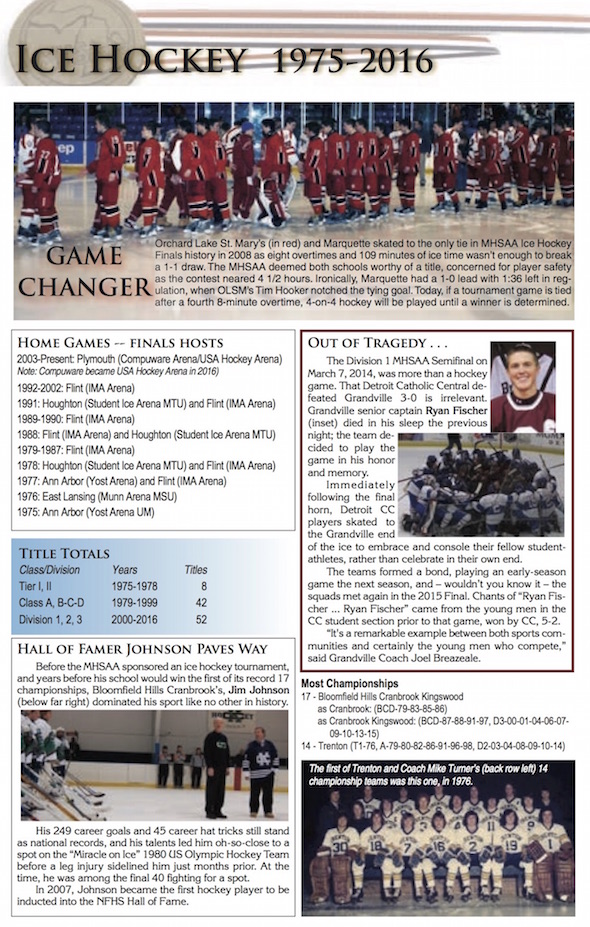 Both are highlighted below in today's look at the history of the MHSAA hockey tournament. This feature is from the spring issue of benchmarks, built and written by Rob Kaminski. Scroll to the bottom of the page for a link to our previous installments.