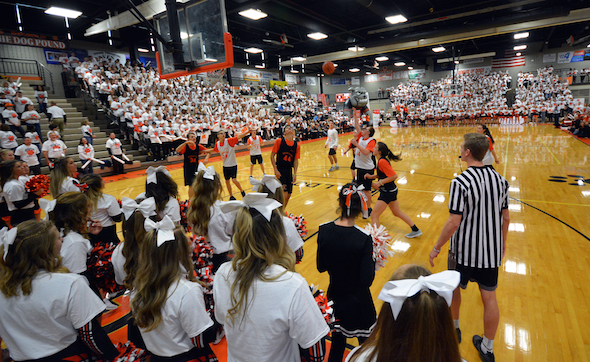 PHOTOS: (Top) Unified teams from Brighton and Mason/Holt play during the second day of the MHSAA 11-Player Football Finals at Ford Field. (Top middle) Participants from those three schools and Sparta took part in the morning's games. (Middle) Sparta athletes stand together for the national anthem. (Below middle) A Brighton coach and players exchange high fives. (Below) Brighton's Unified basketball team plays during a celebration for receiving national recognition last fall. (Photos by John Johnson.)