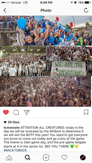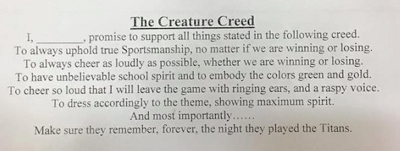 There’s no question. In the video above you’ll hear Priest talk about being emotionally tied to her work with the Bleacher Creatures, and that passion is similar to what we found with last year’s leaders as well. Take as another example the annual “Patriot Game” – that football game between West and Central that led students to line up at 8 a.m. to get the best seats for a game that regularly draws upward of 8,000 fans including most of both student bodies. In the video above you’ll see Creatures before the Friday's game reciting “The Creature Creed” below, written by Schriber and Thompson this winter and another example of what’s behind the section spirit.