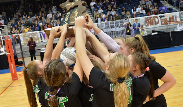 PHOTOS: (Top) Mendon celebrates its second-straight Division 4 championship Saturday at Kellogg Arena. (Middle) Mendon’s Ryley Mullin (11) and Leland’s Olivia Lowe battle at the net.