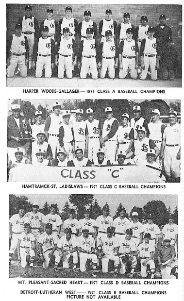 PHOTOS: (Top) Detroit Lutheran West stands together for a team photo; it won the inaugural Class B title. (Middle) Champions of the first MHSAA Tournament, in 1971, included Harper Woods Bishop Gallagher, Hamtramck St. Ladislaus and Mount Pleasant Sacred Heart.
