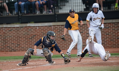 PHOTOS: (Top) Warren DeLaSalle's Nino Puckett prepares to deliver a pitch during Thursday's first Division 1 Semifinal. (Middle) Saline's Cole Daniels slides in safely as Hartland catcher Cade Martin tries to make the tag during the second Semifinal.