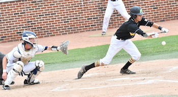 PHOTOS: (Top) Bishop Foley pitcher Justin Campbell delivers during Saturday’s Division 3 Final. (Middle) A Ventures hitter gets down a bunt.
