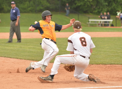 PHOTOS: (Top) Hartland players celebrate a 10-inning win and their first MHSAA baseball championship. (Middle) Max Cadman (13) slides into third base ahead of a throw as Portage Northern’s Thomas Scheffert prepares to tag.