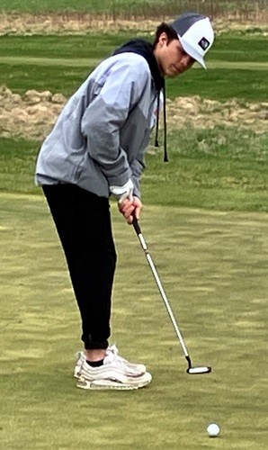 PHOTOS (Top) Eli Graves, left, and Gavyn Merchant are among standouts for Kingsley’s baseball team again this spring. (Middle) Merchant (6) hands the ball off to Graves during the Division 6 championship win at Ford Field. (Below) Merchant putts during Thursday’s golf opener. (Baseball photos by Karen Middleton.)