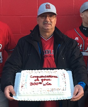 PHOTOS: (Top) Rollie Carman, then coach at Ithaca, talks with an umpire during a 2012 game. (Middle) Carman, now coach at St. Louis, holds up the cake presented after winning the 300th win of his career last week. (Top photo by HighSchoolSportsScene.com, bottom courtesy of St. Louis athletic department.)