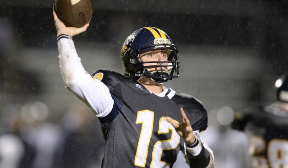 PHOTOS (Top) Pontiac Notre Dame Prep quarterback Sam Stowe (15) throws a pass during the Division 5 Final while protected by lineman Adrian Fernandez (56). (Middle) Fighting Irish coach Pat Fox leads his team – including Henry Ewles (72) and Brody Sink (7) – off the field.