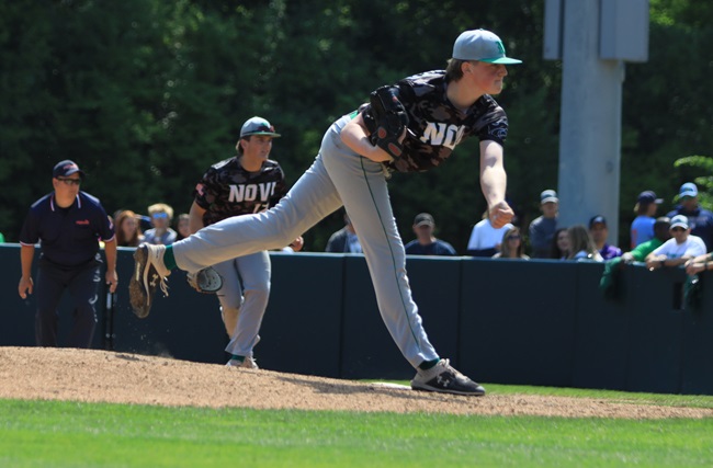 PHOTOS (Top) Novi pitcher Uli Fernsler makes his move toward the plate this season. (Middle) Fernsler follows through on a pitch during the 2023 Division 1 Final. (Top photo courtesy of the Novi athletic department.)