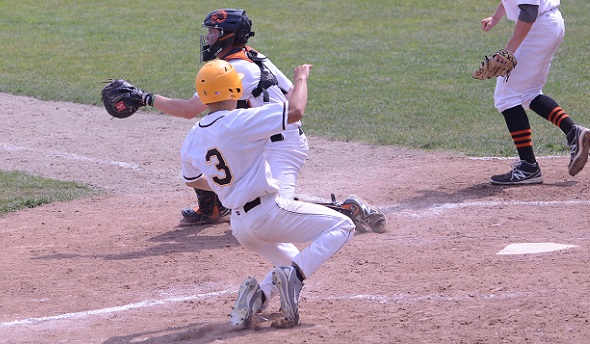 PHOTOS: (Top) Bay City Western sophomore David Fegan slides into home for the Warriors' deciding run in a 1-0 win Saturday at Bailey Park. (Middle) Senior Connor Foley threw a complete game in earning the win on the mound for Bay City Western. (Click to see more from Hockey Weekly Action Photos.)