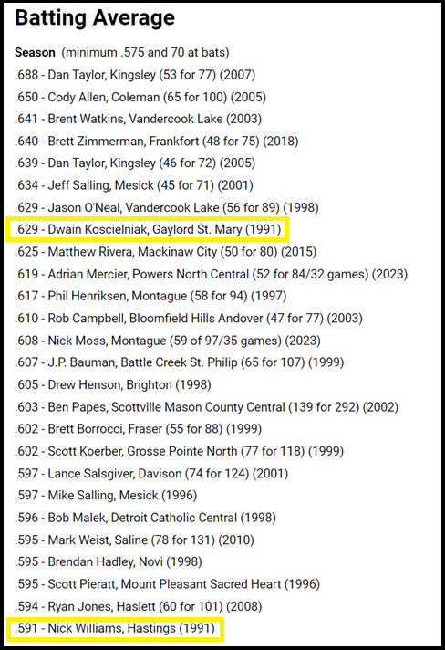 It wasn't so much that Hastings' Nick Williams and Dwain Koscielniak of Gaylord St. Mary were aware in 1991 of becoming the first MHSAA-recognized .600 hitters in state history. What the two remember most about their magical final high school seasons has little to do with records, but simply closing out outstanding baseball careers with a bang.