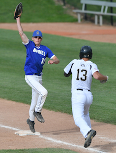 PHOTOS: (Top) Summerfield's Brock Olmstead unwinds toward the plate during his team's Division 4 Semifinal win Friday. (Middle) Nouvel's Michael Ehlman (11) snags a throw at first base just in front of Decatur runner Justin Gale.