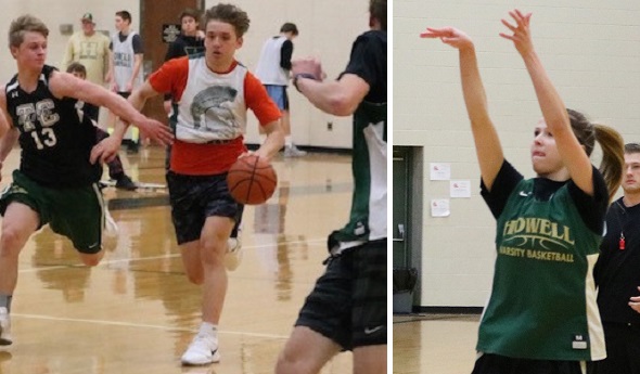 PHOTOS: (Left) Howell’s Josh Palo pushes the ball upcourt during a practice this winter. (Right) Lexie Miller works on her shooting; she’s averaging 25 points per game. (Photos by Tim Robinson.)