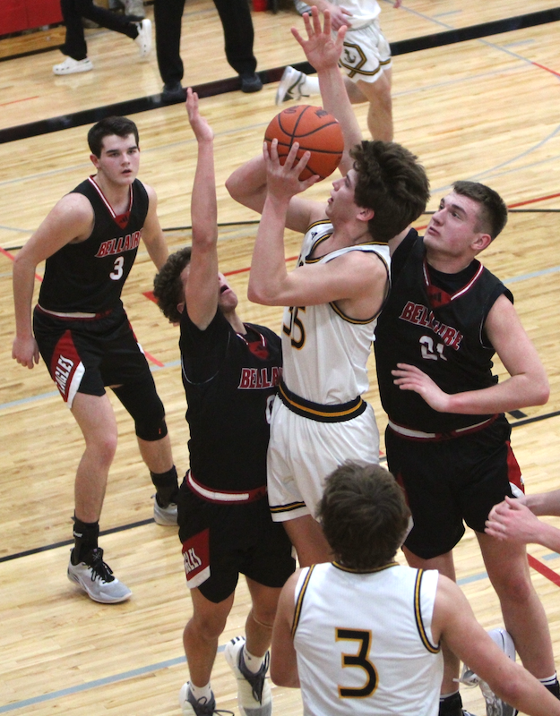 PHOTOS (Top) Jason Bradford, kneeling, coaches the Maple City Glen Lake boys varsity after taking over the program earlier this season. (Middle) Glen Lake’s Cooper Bufalini (11) pushes the ball upcourt during a 65-49 District Final win over Bellaire. (Below) The Lakers’ Jacob Plamondon (35) makes a strong move to the basket. (Top photo by RD Sports Photo/Rob DeForge, additional photos by Nicole Bixby.)