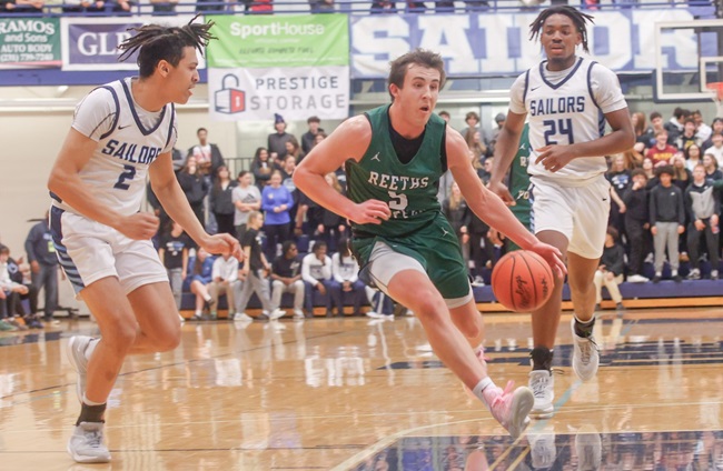 PHOTOS (Top) Muskegon Reeths-Puffer’s starters including Travis Ambrose (21) and Jaxson Whitaker (5) huddle before the start of Friday’s win over Mona Shores. (Middle) Ambrose dunks against Zeeland East. (Below) Whitaker gets to the lane as Sailors defenders converge. (Photos by Joe Lane/Joe's Creative Expressions.)