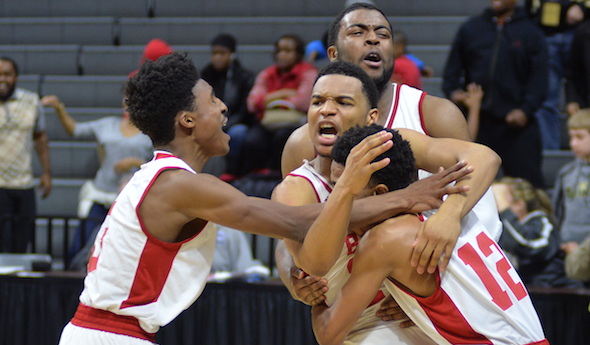PHOTO: Beecher players embrace Malik Ellison after his game-winning shot Thursday. (Middle) Loyola’s Pierre Mitchell works to get a shot up while surrounded by Beecher defenders.