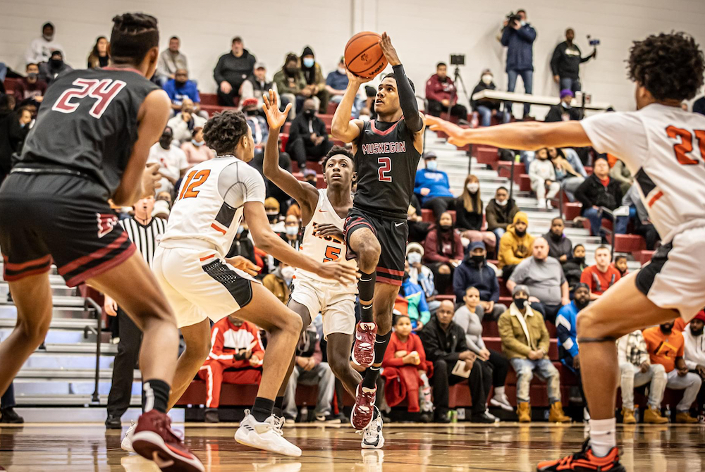 PHOTO Muskegon and Benton Harbor, here during a Jan. 8 Big Reds win, are among teams expected to contend in their respective divisions when MHSAA playoffs begin in two weeks. (Photo by Tim Reilly.)