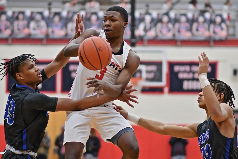 PHOTO A pair of Carman-Ainsworth defenders wall off the passing lanes during last week’s 64-63 loss to Grand Blanc. (Photo by Terry Lyons.)