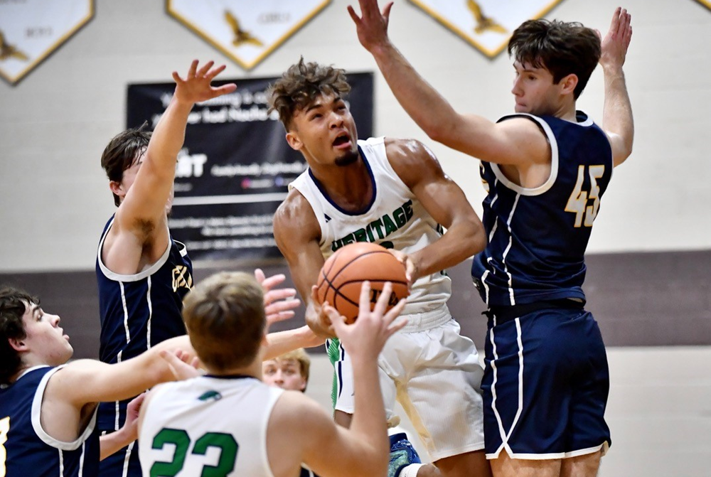 PHOTOS (Top) Braylon Isom gets to the basket for Saginaw Heritage during the Hawks’ 73-66 win over Chelsea on Dec. 29 at the Motor City Roundball Classic. (Middle) Iron Mountain's Oskar Kangas goes up for a shot while being defended by Ishpeming Westwood's Edward Anderson during the Mountaineers’ 67-43 win Friday. (Photos by Terry Lyons and Cara Kamps, respectively.)