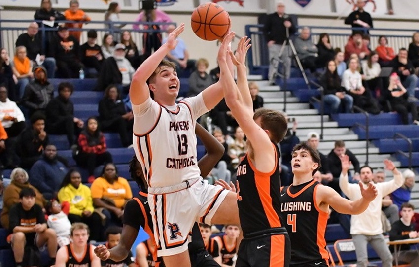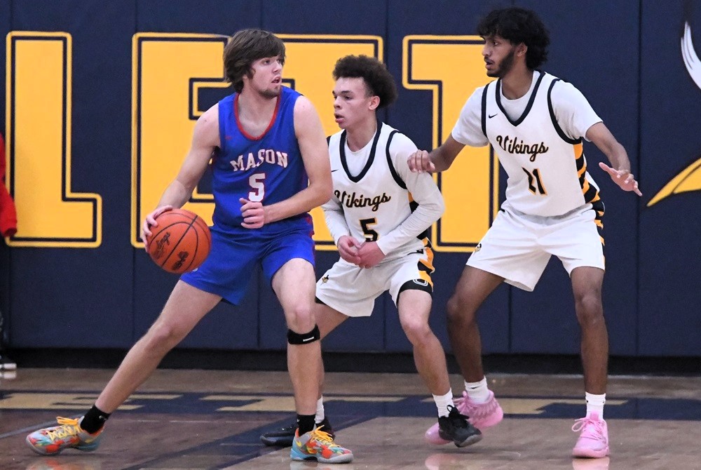 PHOTOS (Top) Mason’s Cason Carswell (5) considers his options during a 65-63 win over Haslett on Friday, as the Vikings’ Wardrell Wicker (5) and Rishon Karikalan (21) defend. (Middle) Flint Powers Catholic’s Jesse Cull (13) gets up a shot during his team’s 69-59 win over Flushing on Tuesday. (Mason/Haslett photo by John Johnson. Powers/Flushing photo by Terry Lyons.)