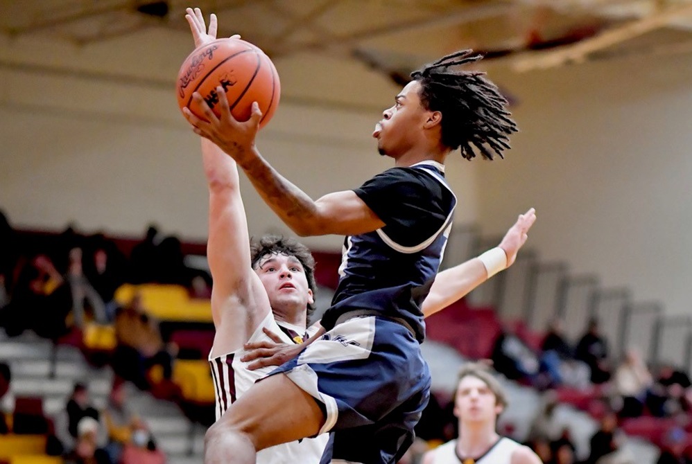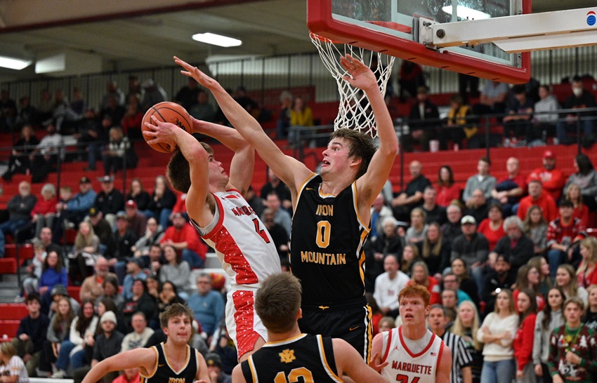 PHOTOS (Top) A Mt. Morris player soars toward the basket during his team's 70-42 loss at Davison last week. (Middle) Iron Mountain's Oskar Kangas blocks a shot by Marquette's Kyler Sager during their teams' December matchup, won by the Sentinels 67-47. (Mt. Morris/Davison photo by Terry Lyons. Iron Mountain/Marquette photo by Cara Kamps.)