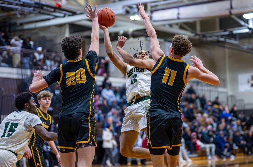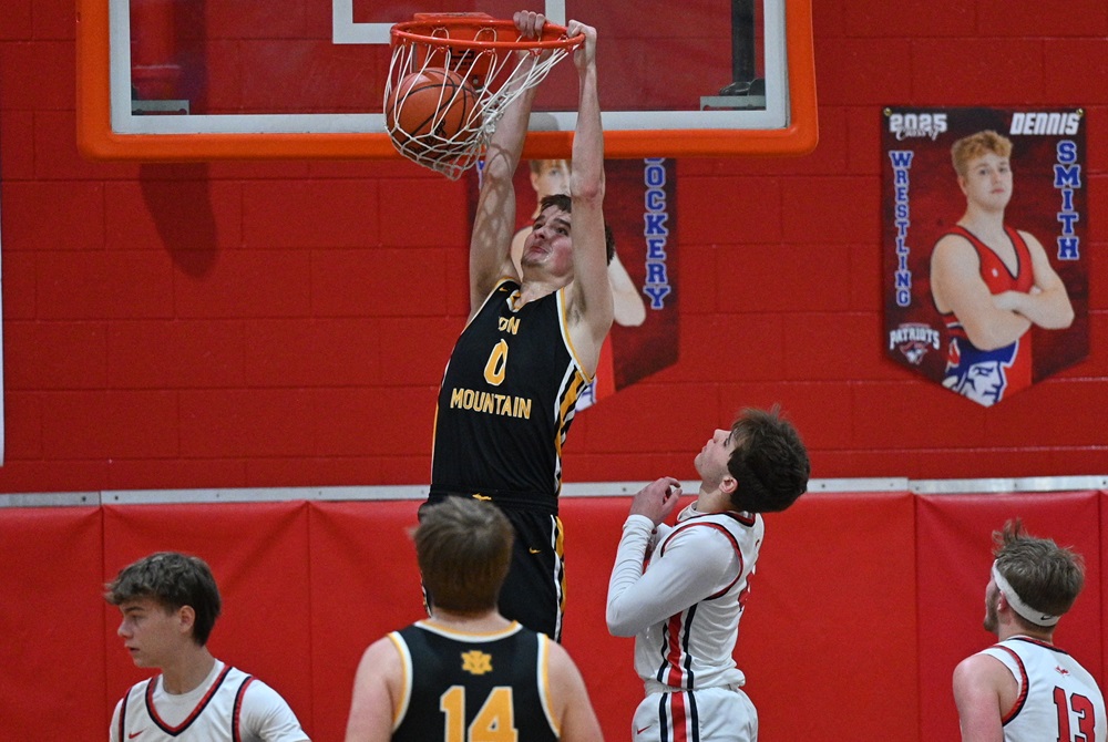 PHOTOS (Top) Iron Mountain's Oskar Kangas (0) dunks the ball off a fourth-quarter inbounds pass during his team’s 58-32 win over Ishpeming Westwood on Thursday. (Middle) Detroit Cass Tech’s Donavin Eddins (12) gets up a shot in traffic during his team’s 68-57 win over Rochester Adams on Dec. 30. (Iron Mountain/Westwood photo by Cara Kamps. Cass Tech/Adams photo by Team Arreguin Photos.)