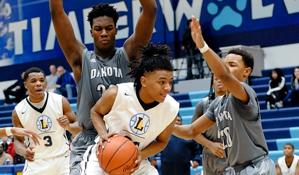 PHOTO: Macomb Dakota defenders surround a Saginaw Arthur Hill player working to get to the hoop during a game earlier this season. (Click to see more at HighSchoolSportsScene.com.)