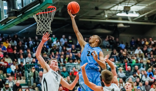 PHOTO: Grand Rapids Christian, driving to the basket, downed Holland West Ottawa on Dec. 28 as part of its 4-0 start. (Photo by Tim Reilly.)