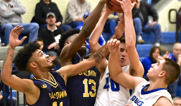 PHOTO: Baldwin and Beal City players work to gain possession during the Aggies’ 55-54 win Jan. 16. (Click for more from HighSchoolSportsScene.com.)
