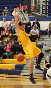 PHOTOS: (Top) Carson Vincent chases down a loose ball against Bridgeport this season. (Middle) Vincent throws down a dunk against Ithaca. (Photos courtesy of the Ovid-Elsie boys basketball program.)