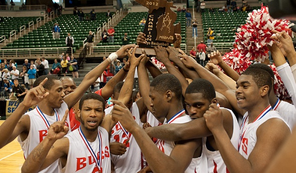 PHOTOS: (Top) Flint Beecher players together hoist the champion’s trophy after Saturday’s Class C Final. (Middle) Beecher junior Monte Morris splits Traverse City St. Francis defenders on his way to the basket. (See more at Terry McNamara Photography.)