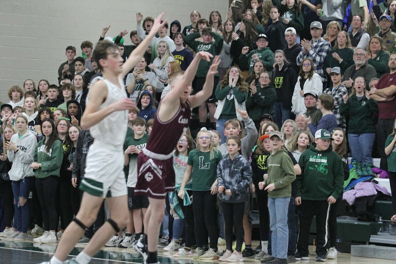 PHOTOS (Top) Cass City’s Carter Patrick, right, looks for an open teammate during a matchup with Laker. (Middle) Michael Fernald brings the ball up court. (Below) Laker fans watch as Trent Patrick sends up his game-winning shot Jan. 27. (Photos by Tom Greene/Huron Daily Tribune.)