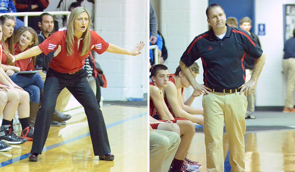 PHOTOS: Heather Huff, left, and husband Troy coach the girls and boys varsity basketball teams, respectively, at Johannesburg-Lewiston. (Photos courtesy of Brandon Folsom/Gaylord Herald Times.)