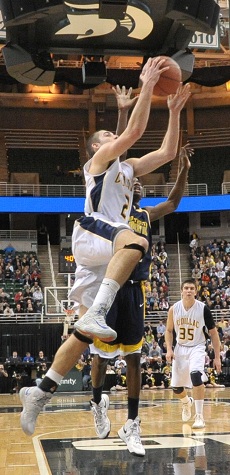 PHOTOS: (Top) Detroit Country Day's Edmond Sumner pushes the ball upcourt Friday while Cadillac's Jalen Brooks (2) and Lewis Finch (15) give chase. (Middle) Brooks makes a strong move to the basket during the Semifinal. (Photos by Hockey Weekly Action Photos.)