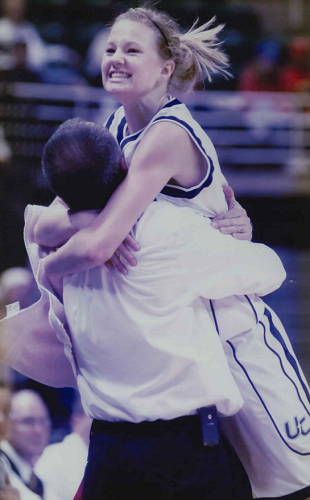 PHOTOS (Top) Hudsonville Unity Christian boys basketball coach Scott Soodsma stands in front of a portion of the school’s trophy case, which he’s helped fill over decades coaching basketball. (Middle) Soodsma and daughter Amber embrace during their team’s 2006 Class B Final victory. (Top photo by Steve Vedder. Middle photo courtesy of the Soodsma family.)