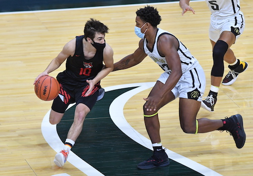 PHOTOS: (Top) Ty Rodgers dunks for two of his nine points for Grand Blanc during Saturday’s Division 1 Final. (Middle) Ann Arbor Huron’s Brandon Rawls (23) keeps the pressure on Jacob Carlson. (Click for more from Hockey Weekly Action Photos.)