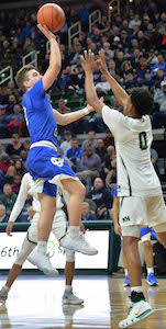 PHOTOS: (Top) Grand Rapids Catholic Central’s Marcus Bingham, Jr., gets a hand on Romeo Weems’ shot Friday at the Breslin Center. (Middle) GRCC’s Austin Braun puts up a shot with Ronald Jeffrey III defending.