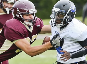 PHOTOS: (Top) Jake Witt blocks a shot during his team's win earlier this month against Bessemer. (Middle) Witt, left, playing for the Ontonagon/Ewen-Trout Creek football co-op team, wraps up an Eben Junction Superior Central ball carrier this fall. (Photos courtesy of the Ironwood Daily Globe.)