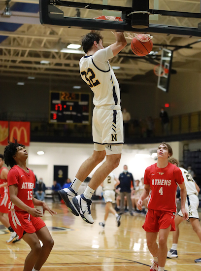 PHOTOS (Top) Port Huron Northern’s Tyler Jamison (32) makes a move toward the basket against Troy Athens on Dec. 30. (Middle) Jamison pulls up for a jumper over a pair of defenders. (Below) The Northern junior dunks for two of his 47 points. (Photos by John Bowns.)
