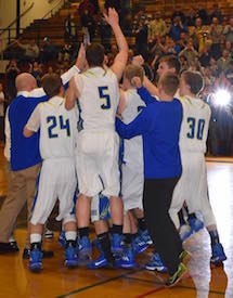 PHOTOS: (Top) Manton’s Trevor Salani works to get around a defender. (Middle top) Buckley celebrates Wednesday’s Regional Final win. (Middle below) Manton’s Wyatt Baker and Hunter Ruell lock down a Boyne City player working toward the basket. (Below) A Buckley player battles for a rebound against Suttons Bay. (Manton photos by Jeannie Christensen; Buckley photos courtesy of Buckley High School.)