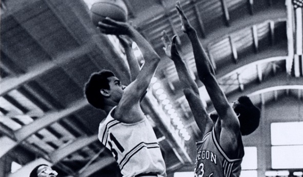 PHOTO: River Rouge’s Leighton Moulton pulls up for a jumper during the 1972 Class B Final. (Photo courtesy of the Lofton Greene Family Archives.)