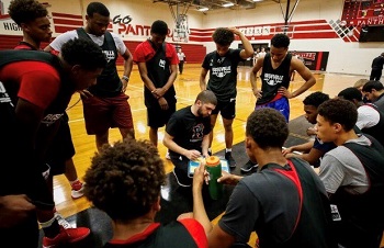 PHOTOS: (Top) Roseville’s John Ukomadu throws down a dunk during a scrimmage. (Middle) Panthers players huddle with coach Hassan Nizam. (Photos by Brian Sevald Photo.)