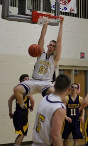 PHOTOS: (Top) Onsted's boys basketball team lines up for the national anthem before their game against Dundee on Feb. 2. (Middle) Guard Austin Thompson drives for a layup against Hudson on Jan. 12. (Middle below) Point guard Dallas Heidbreder sets the offense against Hillsdale on Feb. 5. (Below) Center Austin Davis dunks home two points against Blissfield on Feb. 11. (Photos courtesy of the Onsted boys basketball program.)