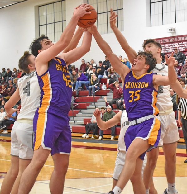 PHOTOS (Top) Bronson senior point guard Kam Brackett (11) looks to score against Sturgis during a game his junior season. (Middle) Bronson senior post player Boston Bucklin (35) battles for a rebound in a District game against Union City last winter. (Below) Vikings head boys basketball coach Damien Loveless, left, is joined by his two returning four-year senior standouts Brackett (middle) and Bucklin. (Top photo courtesy of Brandon Watson/Sturgis Journal. Middle photo courtesy of Troy Tennyson/Coldwater Daily Reporter. Loveless/Brackett/Bucklin photo by Scott Hassinger.)