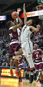 PHOTOS: (Top) Benton Harbor's Carlos Johnson launches the game-winning 3-pointer during overtime of Saturday's Class B Final. (Middle) Johnson (11) gets a hand up as a River Rouge player drives to the basket during Friday's Semifinal.