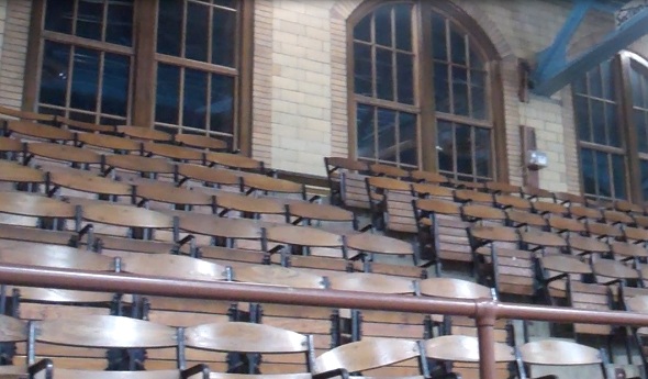 It's an awesome arena straight out of "Hoosiers" or any basketball nostalgia. Fans sit in wooden seats that line both sidelines and are raised up and away from the floor. There are two old-school scoreboards -- one on the wall and the more recent hanging from the rafters.