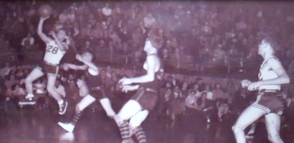 PHOTOS: (Top) Wooden seats line both sidelines at Petoskey's Central School Gymnasium. (Middle) A sideline wall announces "Home of the Northmen" above an early scoreboard. (Middle below) The stands are mostly filled for the 2010 Throwback game as then-junior Cory Starkey, in head band, drives to the hoop. (Below) A photo from a game at Central Gymnasium during a much earlier era hangs in the classroom of Petoskey High teacher Matt Tamm.