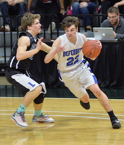 PHOTOS: (Top) Our Lady’s Clay Senerius looks for an opening while Tri-unity’s Javi Cuevas defends. (Middle) The Defenders’ Collin Rosendall works to get past a Lakers player during the Class D Semifinal.