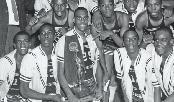 PHOTOS: (Top) Ken Wilburn (25) poses with his teammates after the 1962 Class B championship game victory. (Middle) Wilburn works to gather a loose ball from an East Grand Rapids player.